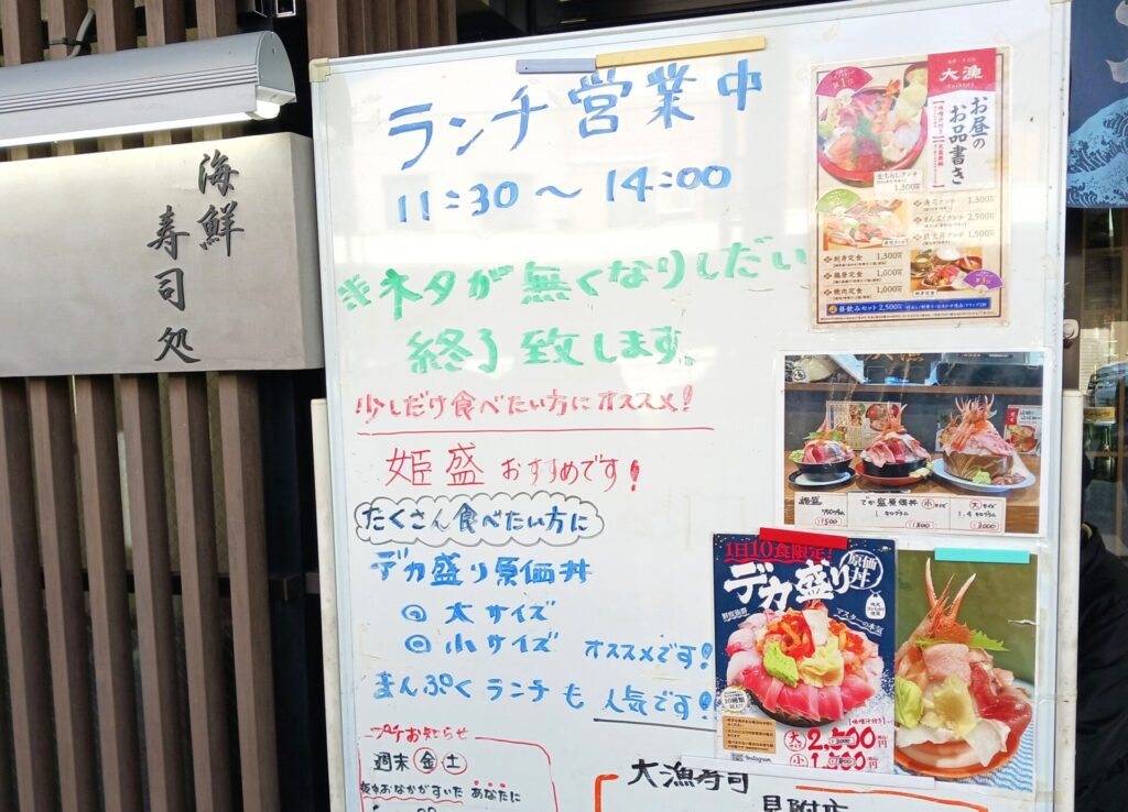 大漁寿司の最大の魅力は、旬の海鮮を贅沢に盛り込んだ名物ランチ。